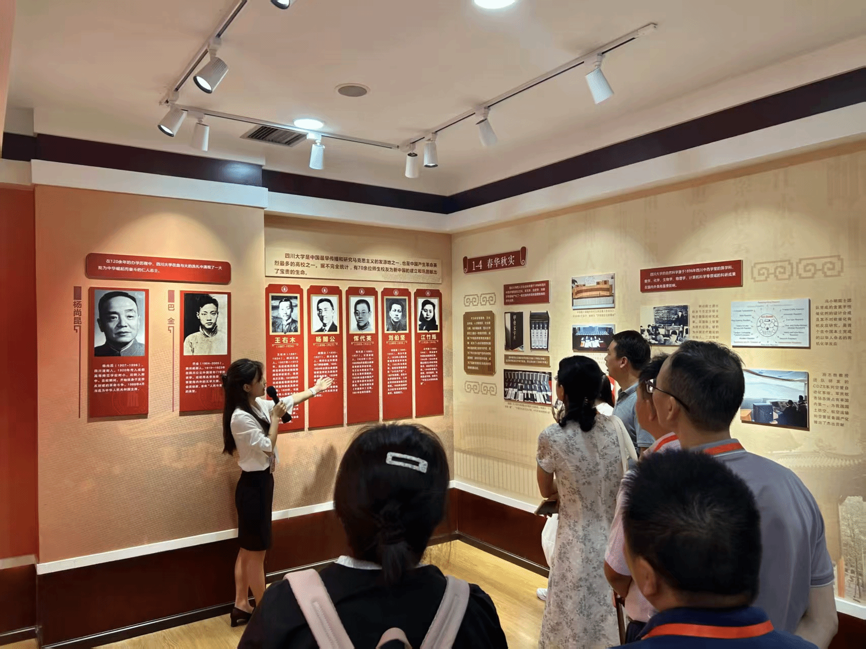 四川大学校史展览馆拥有丰富的校史实物资料和珍品档案,全面反映了四川大学120余年的发展历史,讲述了朱德、郭沫若等著名校友的人物故事,展现了川大人“救国兴国”的光辉奋斗史,体现了中国高等教育事业与中华民族伟大复兴的同频共振。在研修过程中,学员们认真聆听讲解员老师的讲解,仔细观看展览资料,感受“教育强国”的重要意义和时代重托。