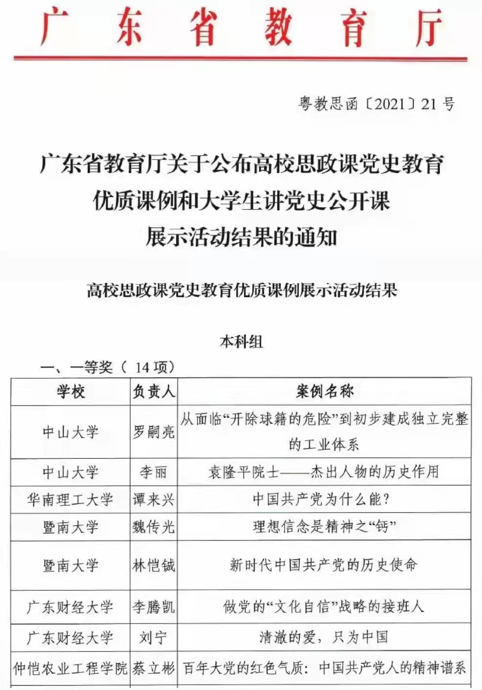 10月21日,广东省教育厅印发了《关于公布高校思政课党史教育优质课例和大学生讲党史公开课展示活动结果的通知》(粤教思函[2021]21号),正式公布了广东省高校思政课党史教育优质课例和大学生讲党史公开课展示活动结果获奖名单。其中,高校思政课党史教育优质课例一等奖29项、二等奖50项、三等奖80项。经各高校推荐和组织专家评审,我校beat365在线唯一官网蔡立彬老师提交的课例《百年大党的红色气质:中国共产党人的精神谱系》喜获一等奖。