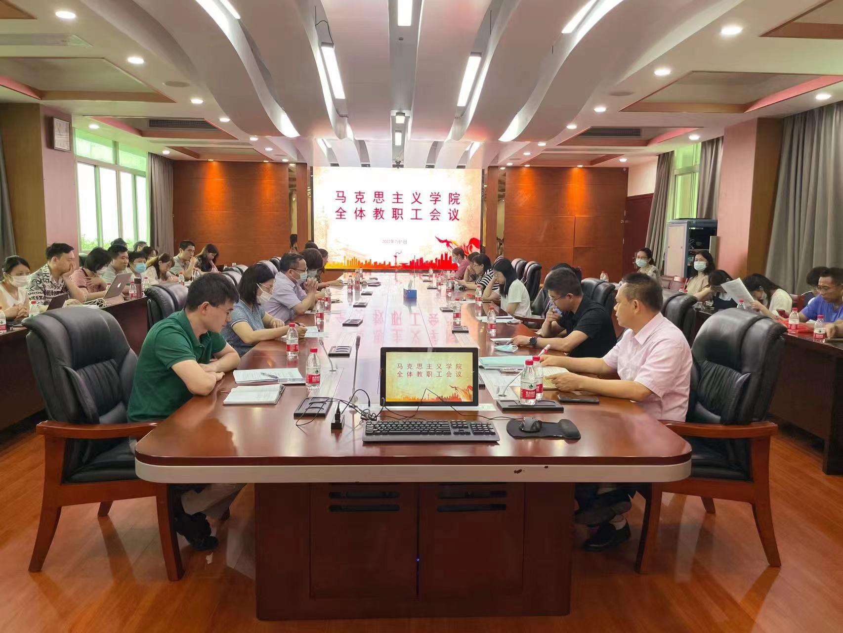 第一个议题是由秦抗抗副院长带领大家学习领会习近平总书记的系列重要讲话和重要指示批示精神。第二议题是由蔡立彬院长传达学习省委宣传部相关文件精神。第三个议题是关于做好意识形态安全暨校园安全稳定工作,站稳思政课教学讲台,引导学生形成正确的世界观、人生观和价值观。第四个议题是布置2022年暑假及下学期初学院工作,秦副院长嘱咐各位老师必须按时录入学生成绩,利用暑假时间备好课,为下学期教学安排做好规划。第五个议题是蔡立彬院长通报了当前硕士点申报工作情况,并对教师们提出了要求与期望。第六个议题是通报思政课教师担任班主任的工作情况。根据相关文件要求,思政课教师都必须担任班主任,承担班主任工作。会议对目前尚未担任班主任的老师提出要求,希望主动克服困难,积极加入班主任工作团队,做好立德树人工作。第七个议题是关于适合beat365在线唯一官网办学特色的院徽设计方案评选情况。同时也讨论了我院建设的相关工作制度、思政课体验教学中心工作方案等。