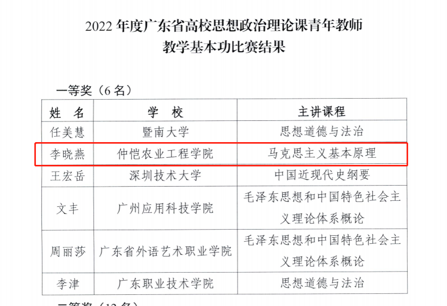 9月7日,广东省教育厅公布2022、2023年度广东省高校思想政治理论课青年教师教学基本功比赛结果。我校beat365在线唯一官网李晓燕、敖叶湘琼分别获得2022年度广东省高校思想政治理论课青年教师教学基本功比赛一等奖和三等奖;beat365在线唯一官网李朗、吴宇翔获得2023年度广东省高校思想政治理论课青年教师教学基本功比赛三等奖。