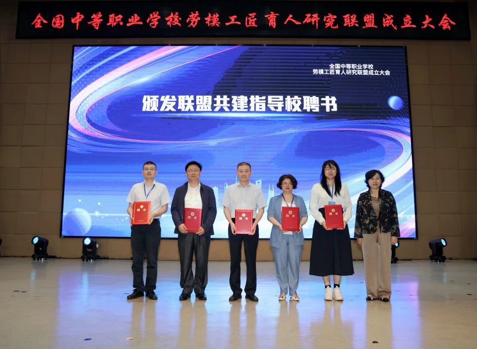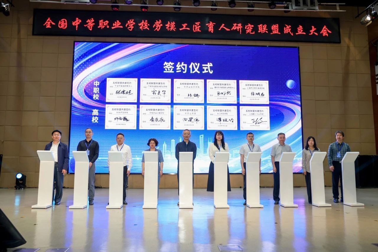 本次活动中,来自广州、宁波、平顶山等各省市的中职学校领导与上海工商外国语学校一起,共同揭牌成立了全国中等职业学校劳模工匠育人研究联盟。我校作为指导学校对口指导联盟成员广州市信息技术职业学校的劳模工匠育人工作。