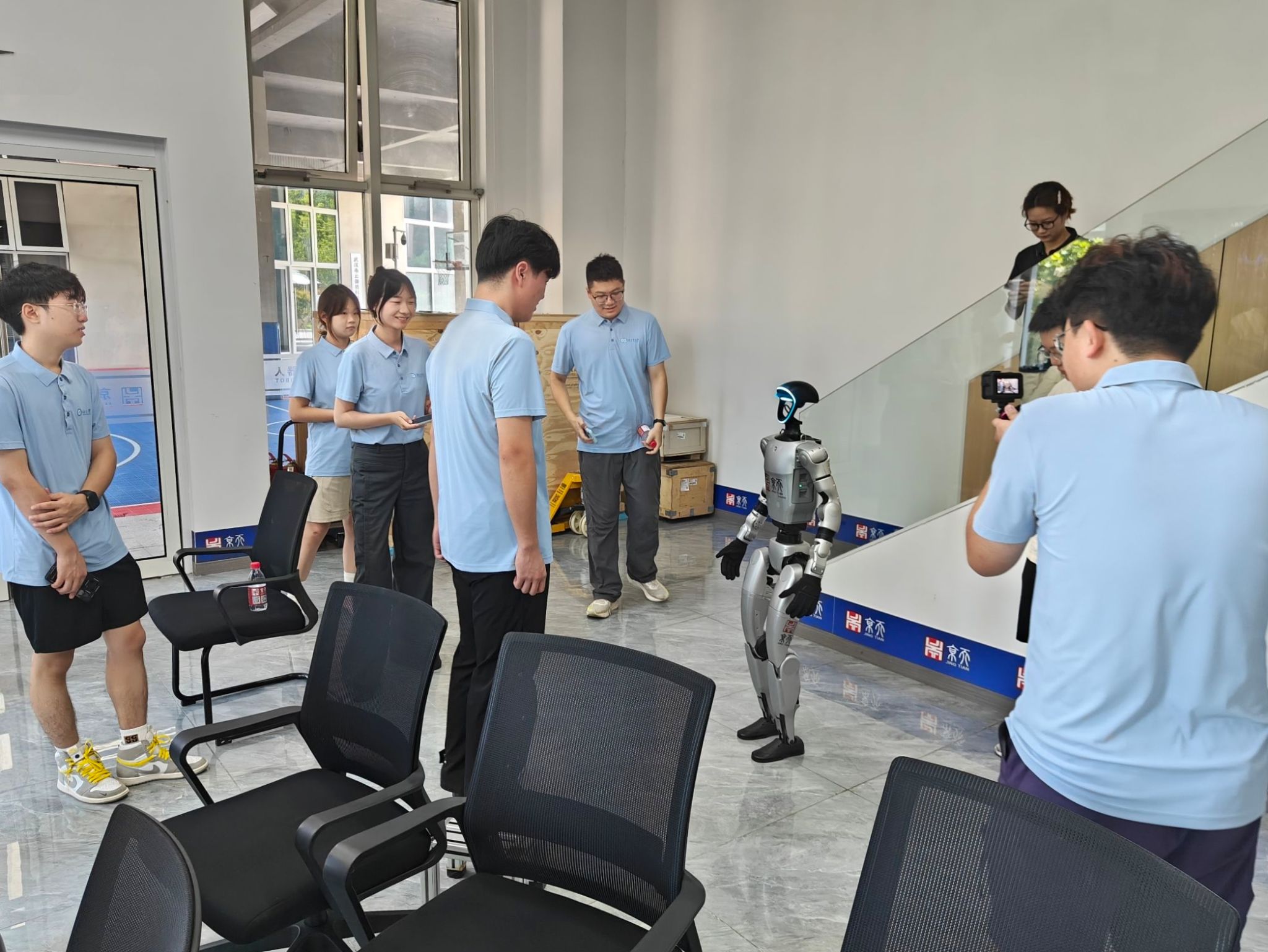 在湖北人形机器人创新中心,队员们实地观摩人形机器人应用场景,深化对湖北具身智能领域的认知。中心负责人介绍,随着人形机器人结构设计优化,它们对复杂环境的适应性与多样化的需求的满足能力将持续提升。针对机器人作业中类人化顺滑动作难以实现的问题,负责人与实践队员共同探讨突破路径,启发了队员们对机器人应用潜力的思考。